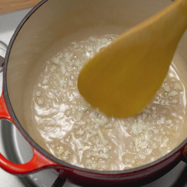 Heat vegetable oil in a pan over low heat. Add garlic and stir-fry until fragrant. Be sure to use low heat to avoid burning the garlic.