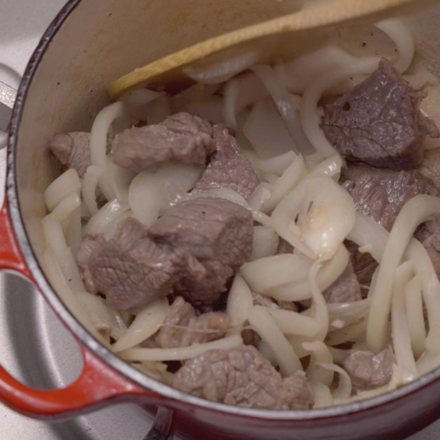 Add beef and cook until browned, then add onion and stir-fry until softened and translucent.
