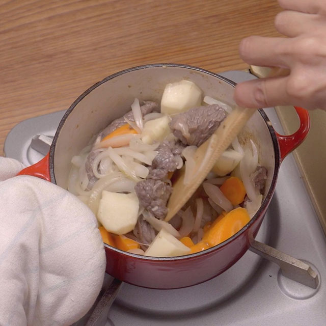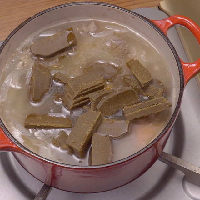 Once vegetables are tender, turn off the heat. Add curry roux and stir thoroughly until completely dissolved.