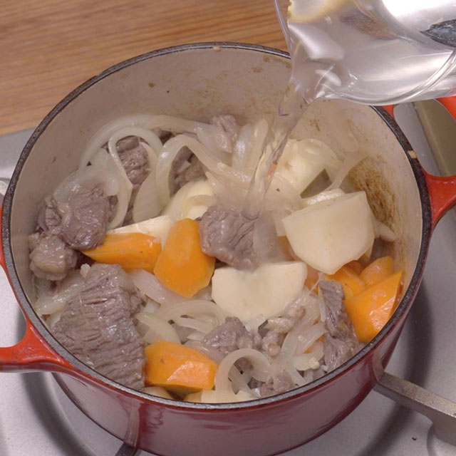 Cut beef into bite-sized pieces and rub with salt and pepper. Thinly slice onion. Roughly chop carrot and potato into bite-sized chunks. Finely chop garlic. Coarsely chop curry roux.