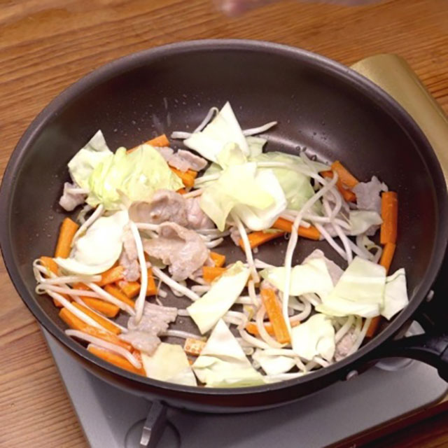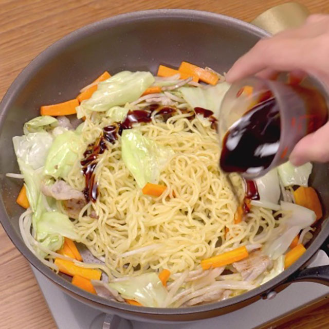 Once vegetables have softened, add yakisoba noodles and continue stir-frying until noodles separate. To make separating noodles easier, warm them slightly in the microwave beforehand.